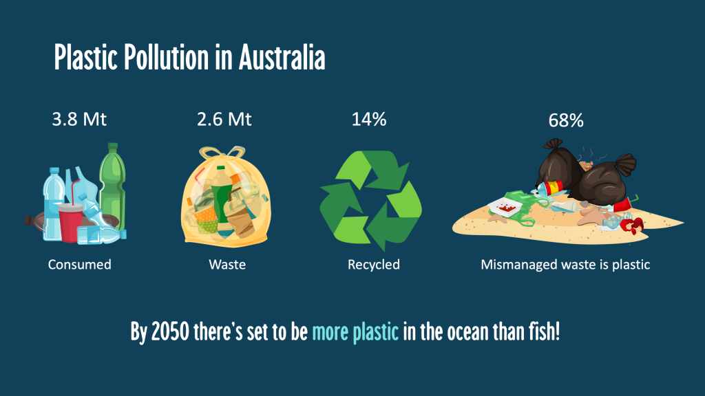 Between 2020 and 2021, Australian consumed 3.8 Mt of plastic (3 times the global average), and this is estimated to reach 8.8 Mt by 2050.