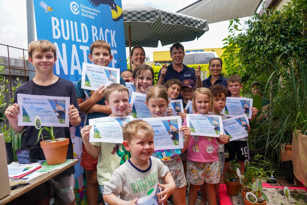Greenery, bark, potting mix and a group of dirt-smeared smiling faces filled the back courtyard garden of The Hideout Café in Narangba on a humid January day. While there was a fun component to this gathering, there was also an important educational element for the next generation. Conservation Volunteers Australia (CVA) hosted a children’s workshop designed to equip the young minds with a wealth of knowledge so they could go on to build their own Nature Blocks.