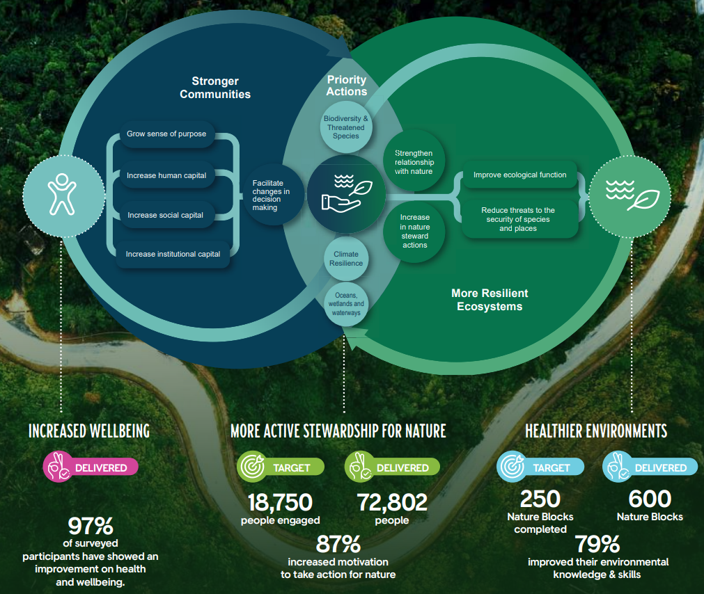CVA has a long history of creating positive impacts for nature through community conservation programs that span over 40 years. The Nature Blocks initiative, while comparatively new – having launched under a year ago, has achieved impressive impact. It is our goal to amplify and expand this impact across Australia, so that we can achieve another 1 million actions for nature by 2030.