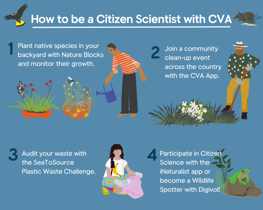 Conservation Volunteers Australia (CVA) has been empowering people to take action for nature since 1982, and we acknowledge the importance of citizen science for conservation as part of our mission.